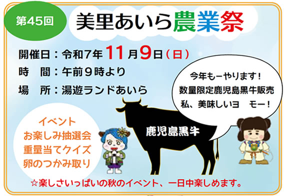 鹿屋市吾平町は、鹿児島県大隅半島のほぼ中央に位置し、地名は日本書記神代記(西暦720年)に「吾平山吾平山上陵」とあるのに由ったもので極めて由緒ある用字です。水質がすばらしく古くから稲作が盛んでしたが、近年は野菜・果物栽培・畜産などを組み合わせた複合経営が多く、美里吾平(うましさとあいら)ブランドとして多くの方に親しまれています。 |